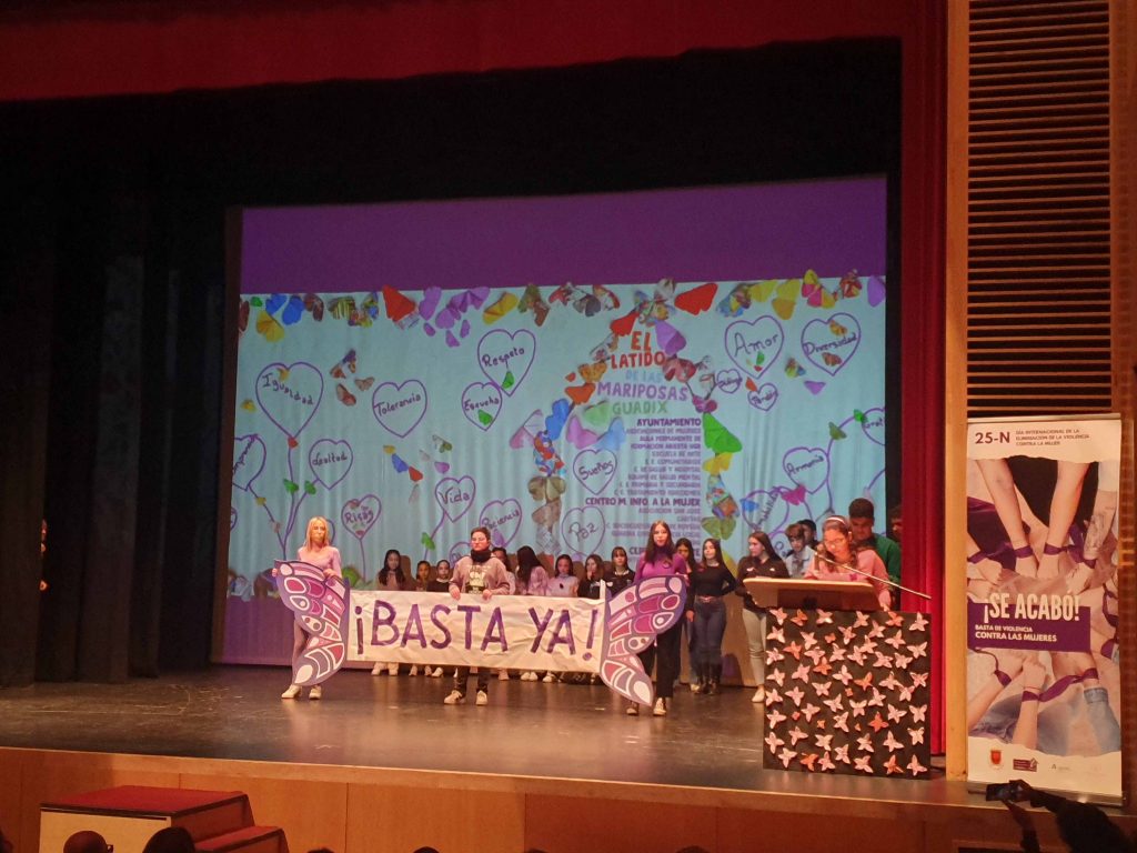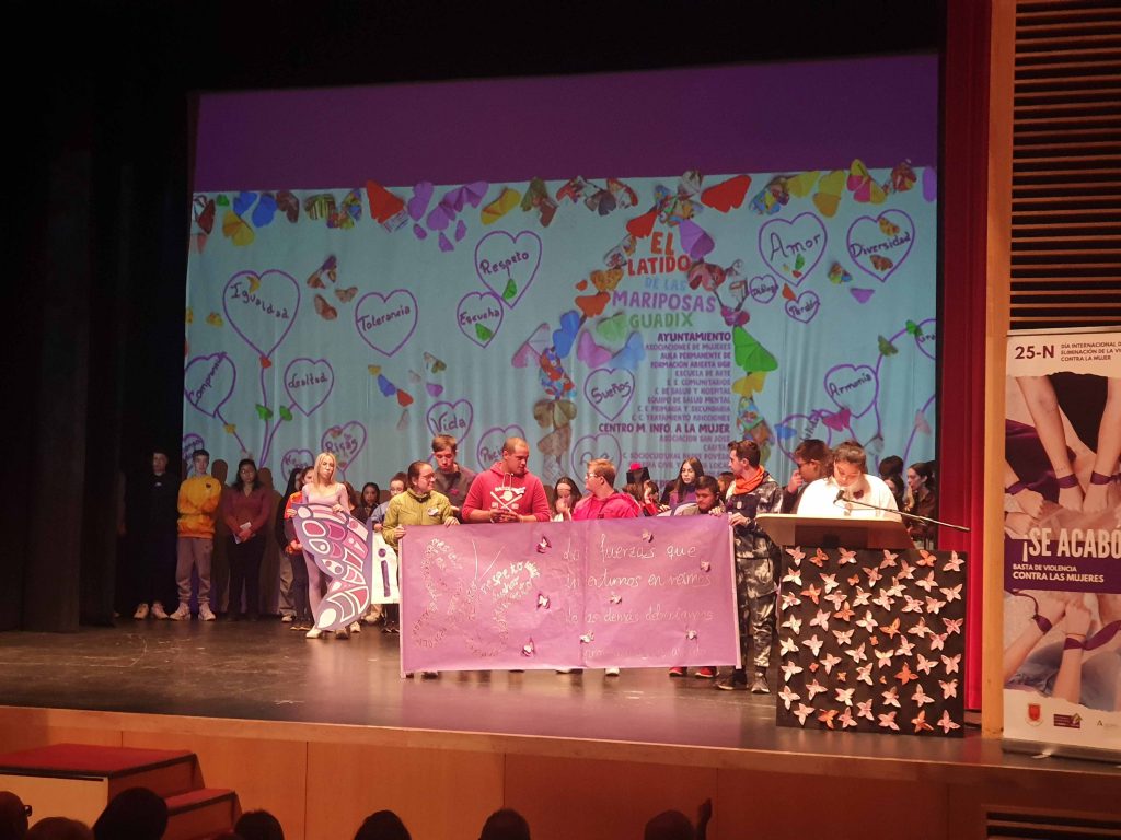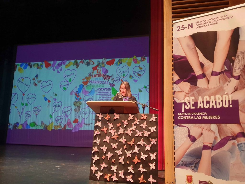 El Ayuntamiento de Guadix ha organizado esta mañana un acto con motivo del Día Internacional de la Eliminación de la Violencia contra la Mujer, que se celebra todos los 25 de noviembre, durante el cual se le ha dado participación a centros educativos y colectivos sociales accitanos, que han mostrado, de una u otra forma, su repulsa a la violencia hacia las mujeres. La concejalía de Políticas de Igualdad, representada por Sofia Aparicio, a través del Centro de Información a la Mujer ha sido la encargada de coordinar este acto, que ha estado basado en el proyecto solidario “el latido de las mariposas, depende de nuestra actitud”.